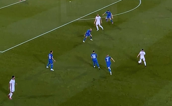 You’ve probably worked out where I am going with this. Having discussed the principles of shielding the ball and Foden’s dribbling technique, I can now illustrate how things played out. I’ve got pictures of the same sequence of events, at four different points in the first half of the game against Slovenia. I’ve only included one picture sequence here to keep things brief.